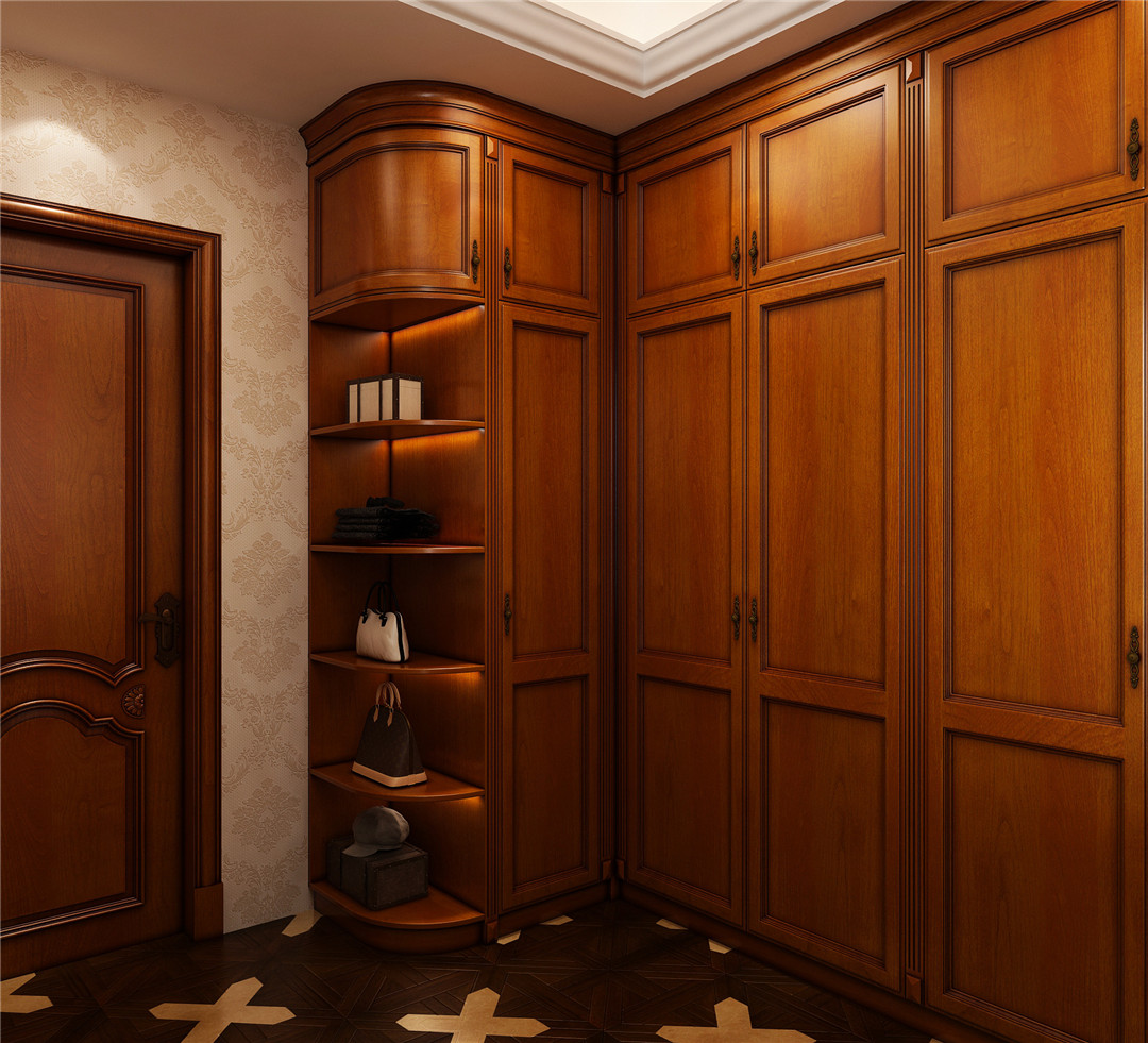 搭配同款衣柜,拐角处弧形装饰柜设计,